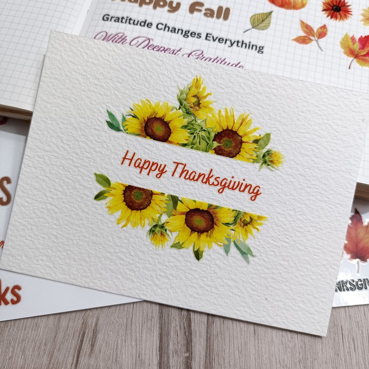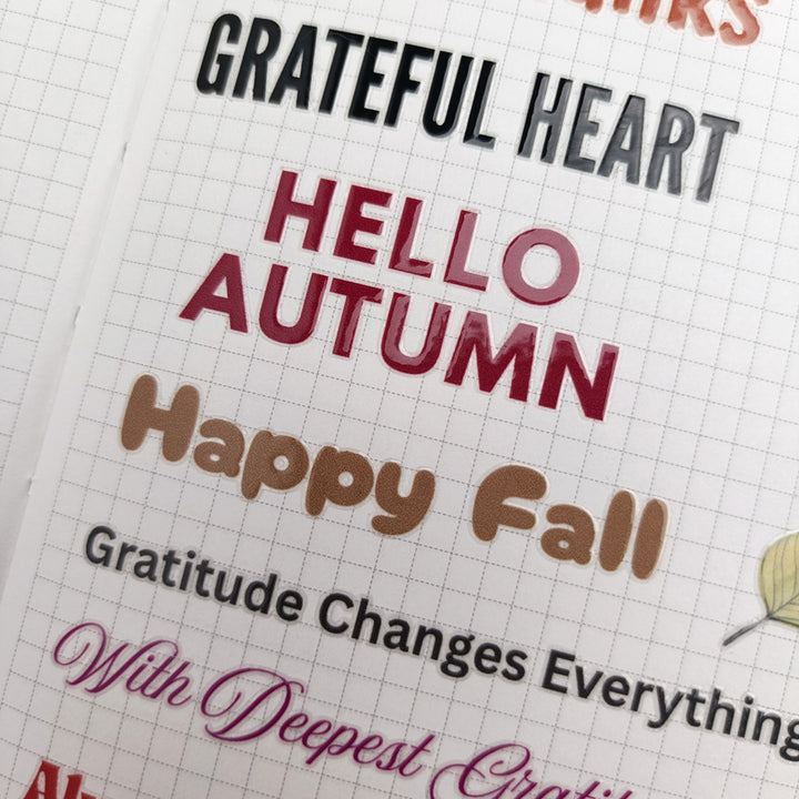 Thanksgiving Sentiments Transfer Stickers can be used on paper surfaces like journals, notebooks, scrapbooks, and cardstock — and on hard, flat surfaces such as glass, wood ornament, phone cases, plastic boxes, ceramic jars, and more.
