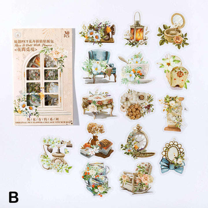 Introducing our Date with Flower theme stickers, inspired by the fusion of flowers and antique artifacts. Perfect for adding a touch of whimsy to your scrapbooking, card making, and various other crafting projects.